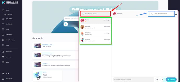 Mit dem 1:1 Chat haben die Mitarbeiter die Möglichkeit, sich innerhalb von keelearning miteinander auszutauschen und zu vernetzen.