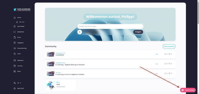 Zusätzlich können Admins aus TAGs Communities bilden. Eine Community ist ähnlich wie ein Lerninhalt zu betrachten, unterscheidet sich jedoch darin, dass sie die beiden Kommunikationsmodule Chat und Ask keelearning (Beta Phase ab 2026 verfügbar) umfasst: