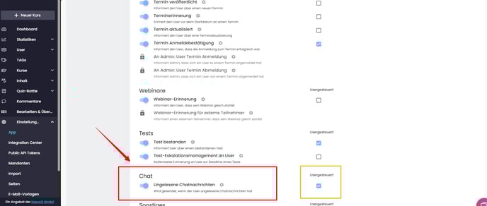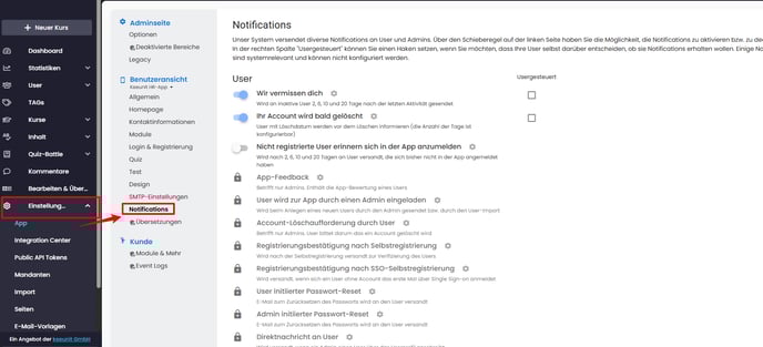 Wie bei vielen anderen Notifications hast du auch hier die Möglichkeit, die Option zu aktivieren, sodass User diese Notifications auch selbst an- und ausstellen können.