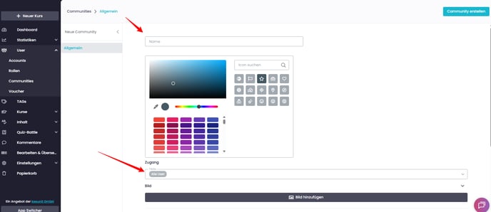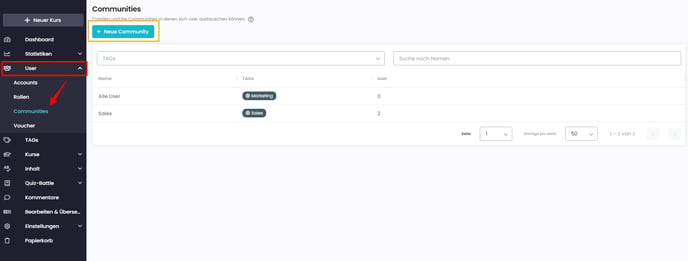 Wähle im Navigationsmenü links "User" aus und wähle den neuen Menüpunkt "Communites" an. Du hast nun oben links die Möglichkeit, eine neue Community zu erstellen.