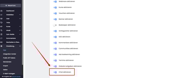 Nachdem deine Communities erstellt wurden, ist es nun an der Zeit, das Chat Modul zu aktivieren. Gehe dazu wieder in deine Einstellungen unter "Module" und aktivieren den Chat: