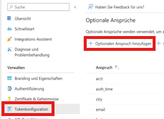 3. Nun gehst du auf "Tokenkonfiguration" -> "+ Optionalen Anspruch hinzufügen"