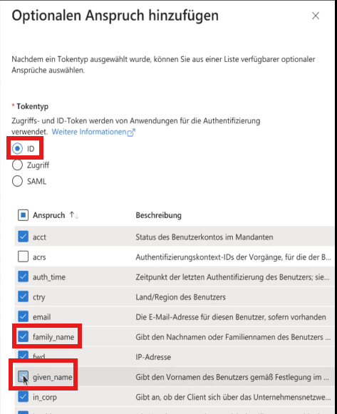 4. Dort wählst du als Tokentyp "ID" aus und aktivierst die Felder "family_name" und "given_name" anschließend bestätigst du es mit "Hinzufügen"